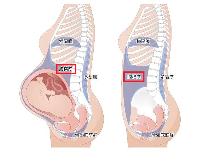 妊娠中、お腹が大きくなるにつれ腹直筋が伸ばされて弱くなります。その結果、体幹を支える腹圧が低下し、腰への負担が増加します。また、出産時に骨盤が広がるため骨盤底筋のゆるみも、骨盤の安定性を低下させ腰痛につながります。特に腰からお腹を取り巻くように付いている腹横筋の弱化は産後の腰痛の大きな要因です。